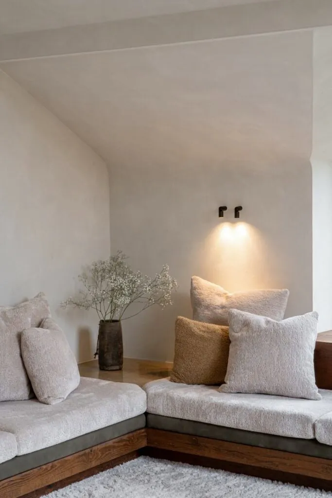 Voor dit project creëerden we op maat gemaakte kussens die perfect passen bij de strakke lijnen van de zetel. De keuze voor een rijkelijk dikke stof voegt een warme en uitnodigende uitstraling toe, waardoor het geheel niet alleen stijlvol maar ook uiterst comfortabel is.