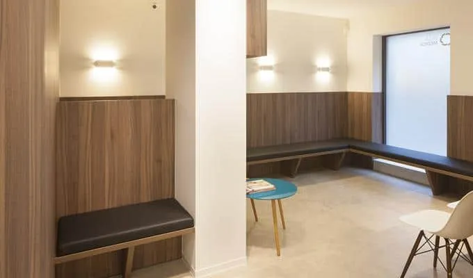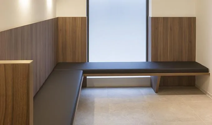 Voor praktijken en wachtkamers worden we vaak bevraagd kussens of wachtmeubilair te maken. De uitvoering gebeurt meestal in hoogwaardig kunstleder, dat zeer onderhoudsvriendelijk is en vaak een healthcare of sanitized label heeft, zodat het ook afwasbaar is met desinfecterende producten. Technische fiches worden steeds voorzien in verband met de onderhoudsvoorschriften. In deze praktijk had de schrijnwerker de legplanken voorzien en maakten we de kussens op maat in zwart kunstleder.